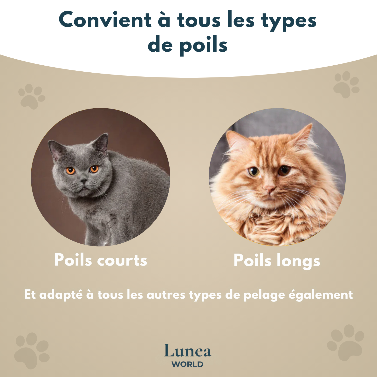Oui, la brosse Félinéa Pro convient à tous les types de poils : courts, longs, épais ou fins. Elle assure un brossage doux et efficace, quel que soit le pelage de votre chat ou de votre chien.
