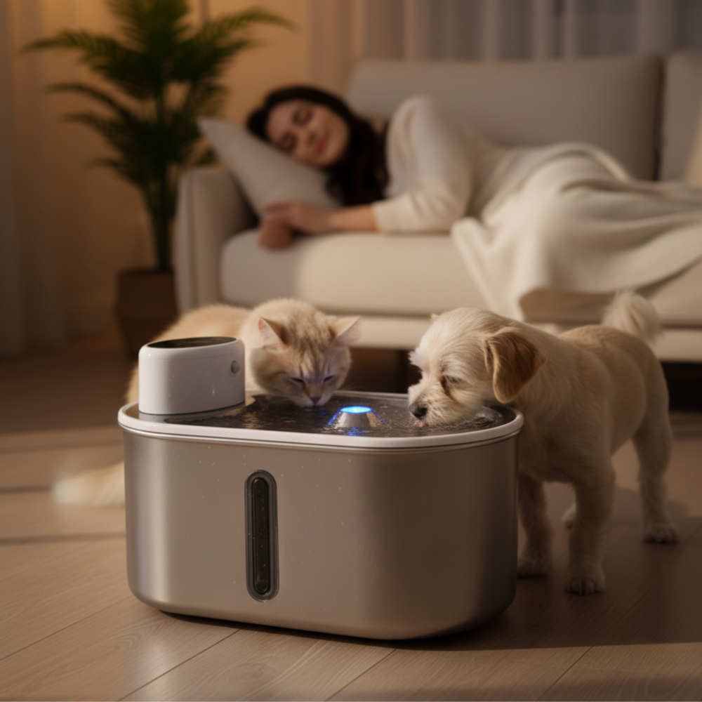 La Fontaine Cristal™ combine design moderne, moteur ultra silencieux (<30dB) et LED apaisante — parfaite de jour comme de nuit.