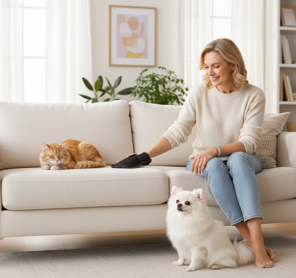 5 minutes par jour suffisent pour dire adieu aux poils sur vos meubles, canapés et habits… et retrouver le plaisir d’une maison propre et accueillante