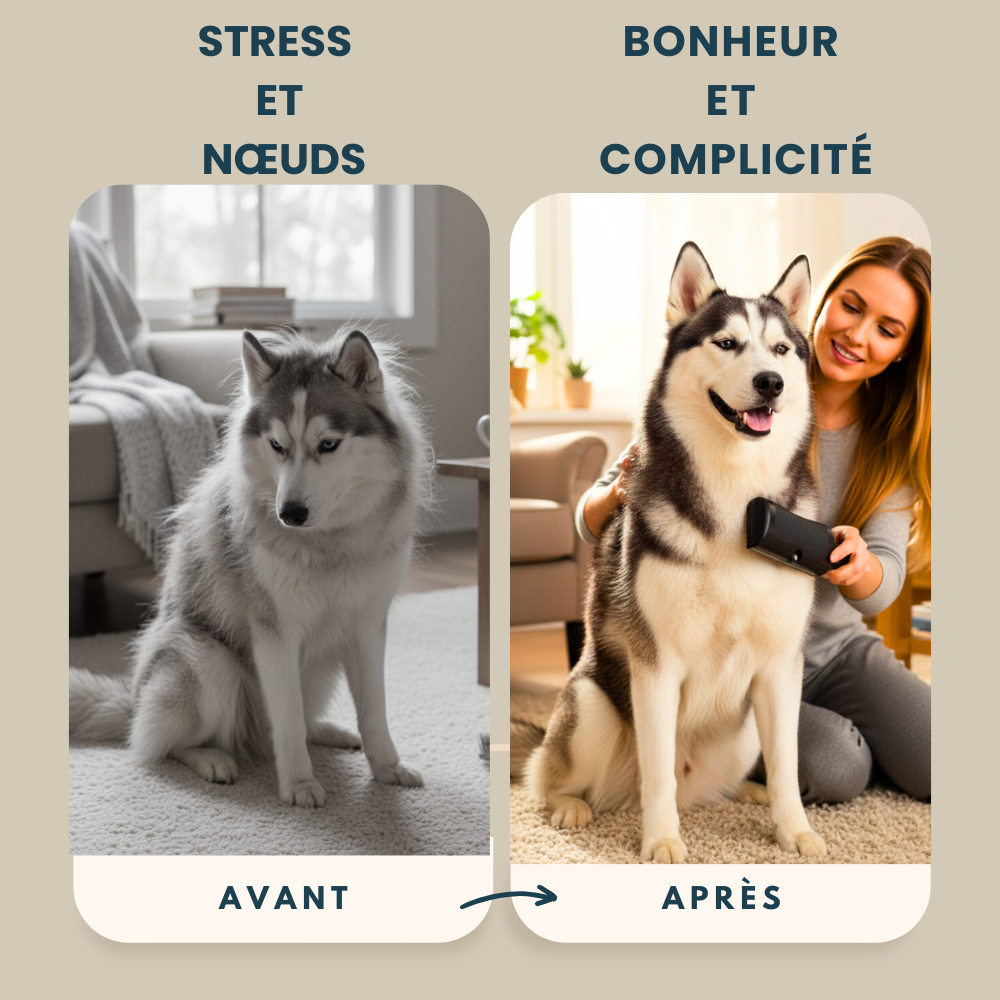 🌟 Confort — Offrez à votre compagnon un soin apaisant qui réduit les poils morts, tout en vous apportant la légèreté d’un quotidien plus simple.